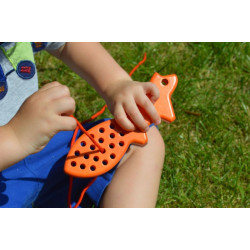 Renard en bois à lacer; il s'agit de passer l'un des 2 lacets en coton dans les trous de la queue du renard.